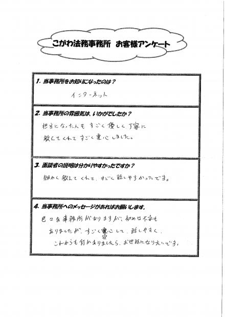 FILE 5 担当になった人もすごく優しく丁寧に教えてくれてすごく安心しました。 事務所の雰囲気は、いかがでしたか? 担当になった人もすごく優しく丁寧に教えてくれてすごく安心しました。 面談者の説明は分かりやすかったですか? 細かく教えてくれて、すごく話しやすかったです。 依頼する前はどのような事を一番お悩みでしたか? 特になし 当事務所へのメッセージがあればお願いします。 色々な事務所がありますが、始めは不安もありましたが、すごく安心できて、話しやすかったです。 これからも何かありましたら、お世話になりたいです。 Y・Mさん ご相談・ご質問等は、下記よりお気軽にお問合せください。 一覧に戻る