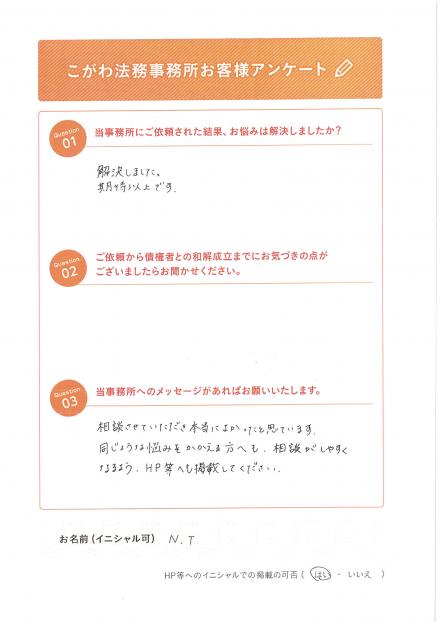 FILE 34 期待以上でした!同じ悩みを抱える方に相談に行ってほしいです。 事務所の雰囲気は、いかがでしたか? 特になし 面談者の説明は分かりやすかったですか? 悩みを解決することができました。期待以上です。 依頼する前はどのような事を一番お悩みでしたか? 特になし 当事務所へのメッセージがあればお願いします。 相談して本当に良かったと思います。 同じような悩みを抱える方へも相談がしやすくなるようにHPに掲載してください。 N.Tさん ご相談・ご質問等は、下記よりお気軽にお問合せください。 一覧に戻る